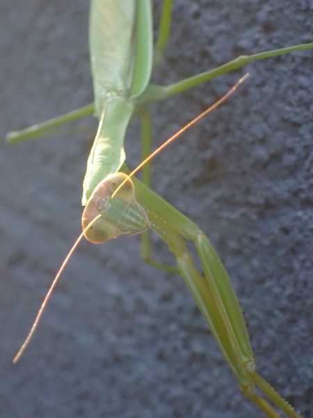 2025.8.26. オオカマキリ?の成虫が壁にとまって、朝陽が当たっていました。
