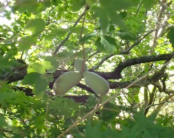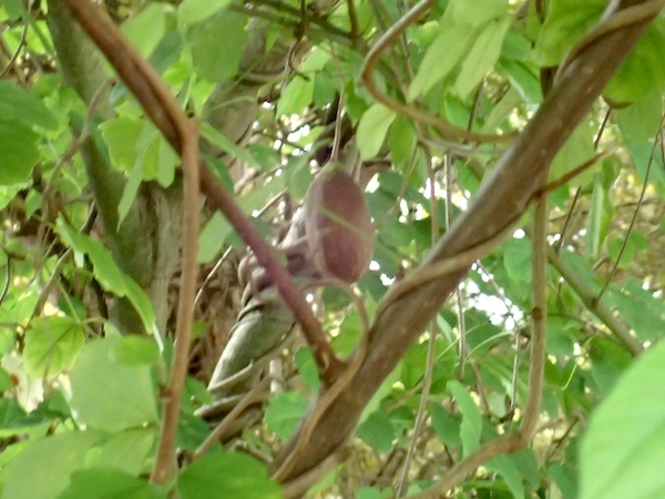 2025.7.20. 朝、晴れて雲がほとんどなく、近くの池のまわりでクマゼミが大合唱、ウグイスも鳴いていました。4月に花が咲いたミツバアケビの実が大きくなっていました。