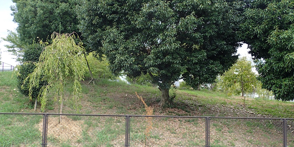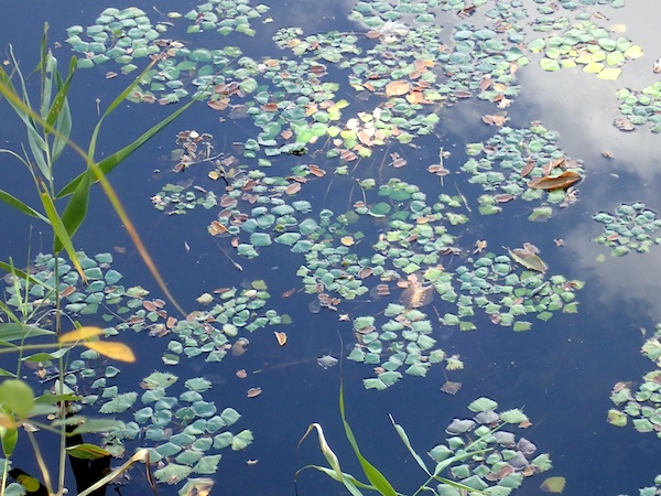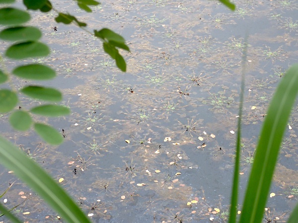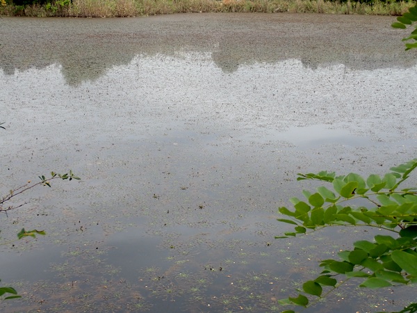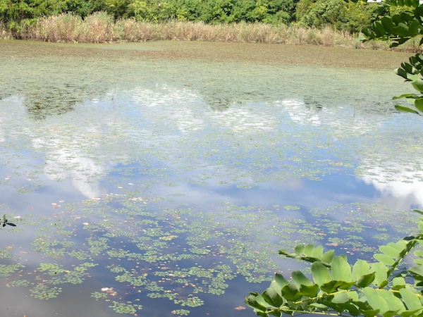 2025.9.3. 近くの池のまわりでツクツクボウシが数匹鳴いていました。池の水面が奥の方からびっしりとヒシで覆われていました。