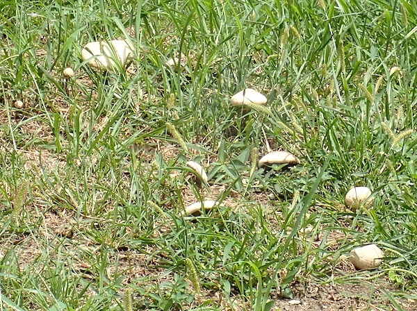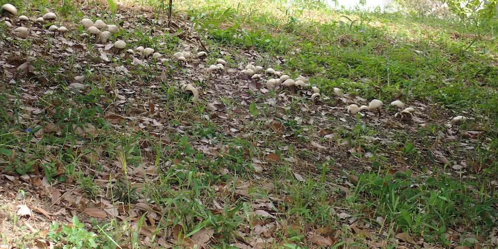 2025.9.20. キノコが大きな半円状にいっぱい出て菌輪を作っていました。 数日前には真っ白なキノコだったそうで、今は傘の色がくすんで、傘の内側が黒っぽくなっていました。また、数年前はドングリの木の手前にきれいな円状の菌輪があり、年々菌輪が大きくなったそうです。