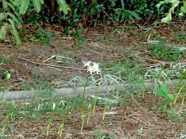 2025.9.24. 近くの池の水面は、三週間前よりさらにびっしりとヒシで覆われていました。白花のヒガンバナが咲き始め、色づいたミツバアケビの実もありました。