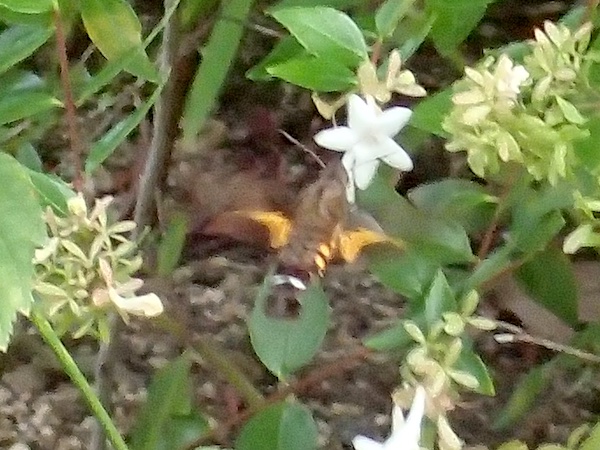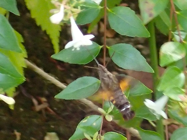 2025.7.23. オオスカシバがアベリアの花から花へと飛びながら吸蜜していました。