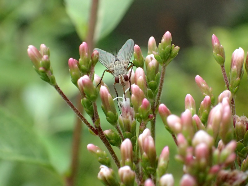2025.9.25. 朝早く、外灯近くのタイルの上にヒロバウスアオエダシャクというガがいて、ゆっくり動き、そのうちいなくなりました。フジバカマの花が少し咲いてきて、クチナガハリバエが吸蜜していました。