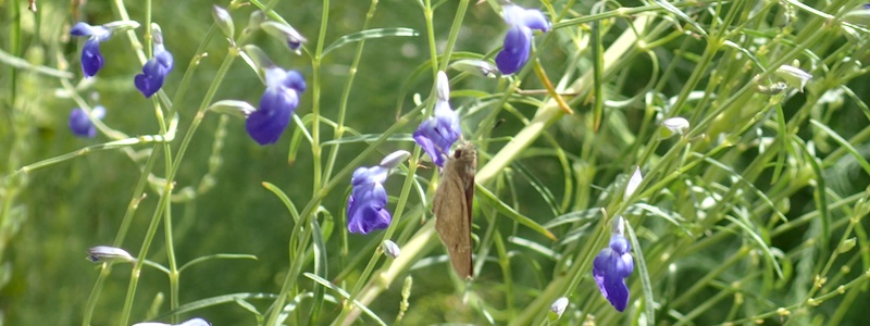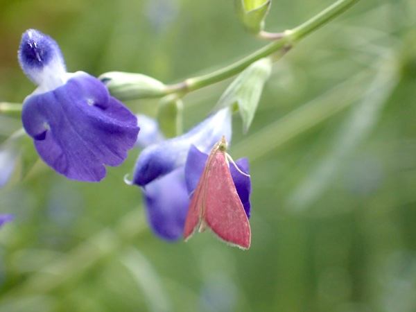 2025.9.28. コバルトセージの花にアメリカピンクノメイガ2匹が離れてとまっていました。幼虫はサルビア属のつぼみを好んで食べるそうです。