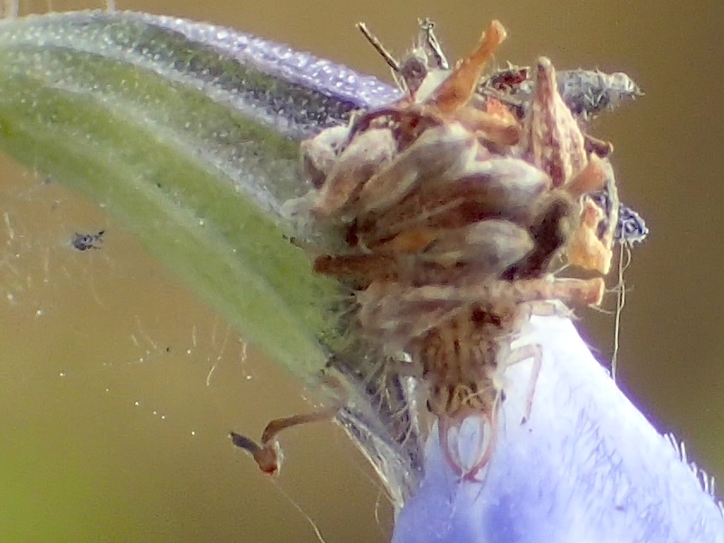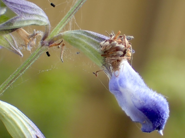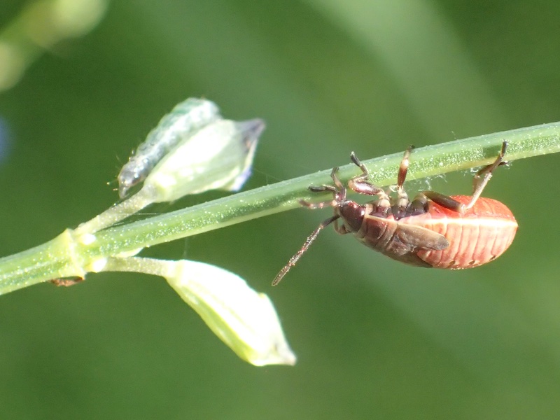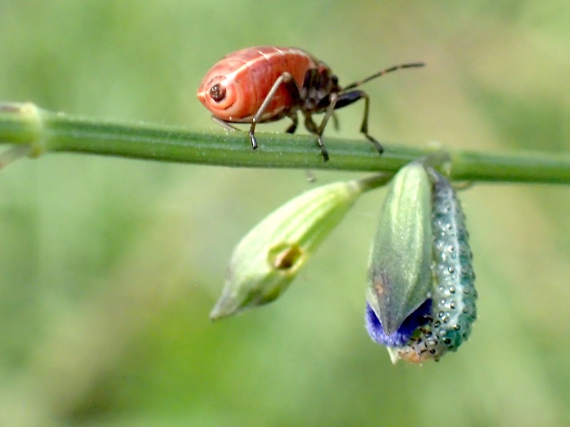 コバルトセージの花のつぼみをアメリカピンクノメイガの透明な幼虫が食べていて、近くに脱皮したてか?やわらかそうな赤いフタモンホシカメムシ?の4齢幼虫?がいました。