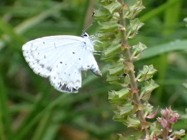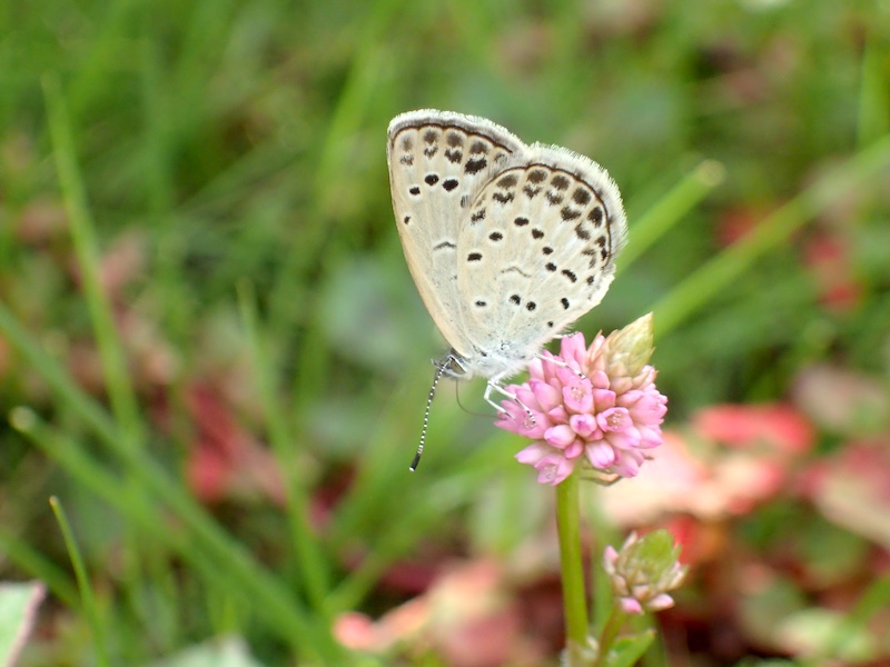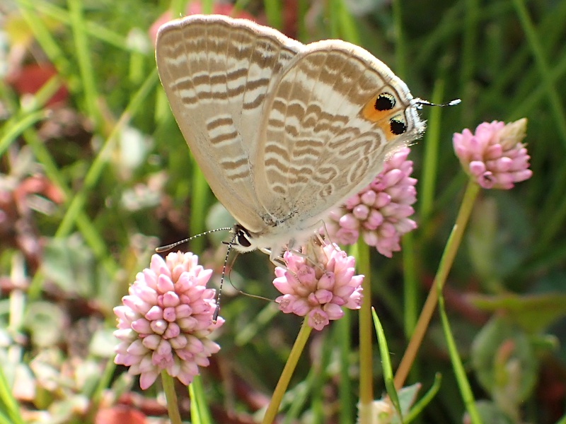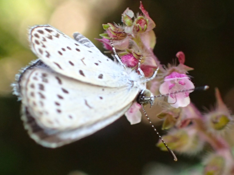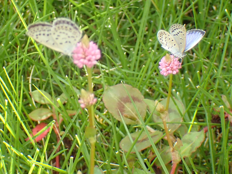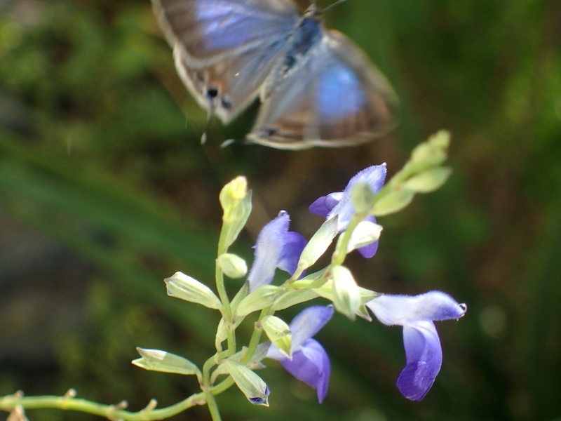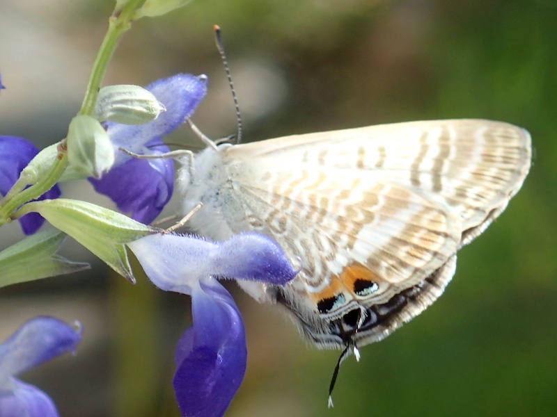 2025.10.8. コバルトセージで、ウラナミシジミシジミ♀1が花から花へ何度もゆっくり吸蜜し、ヒメツルソバでも吸蜜していました。