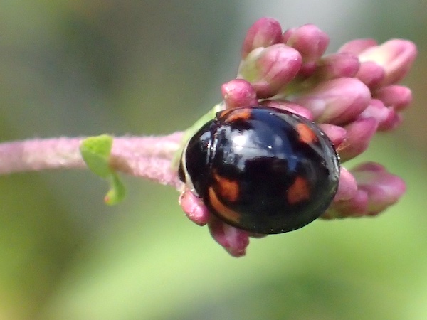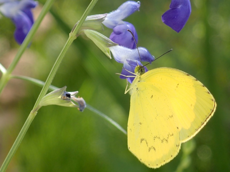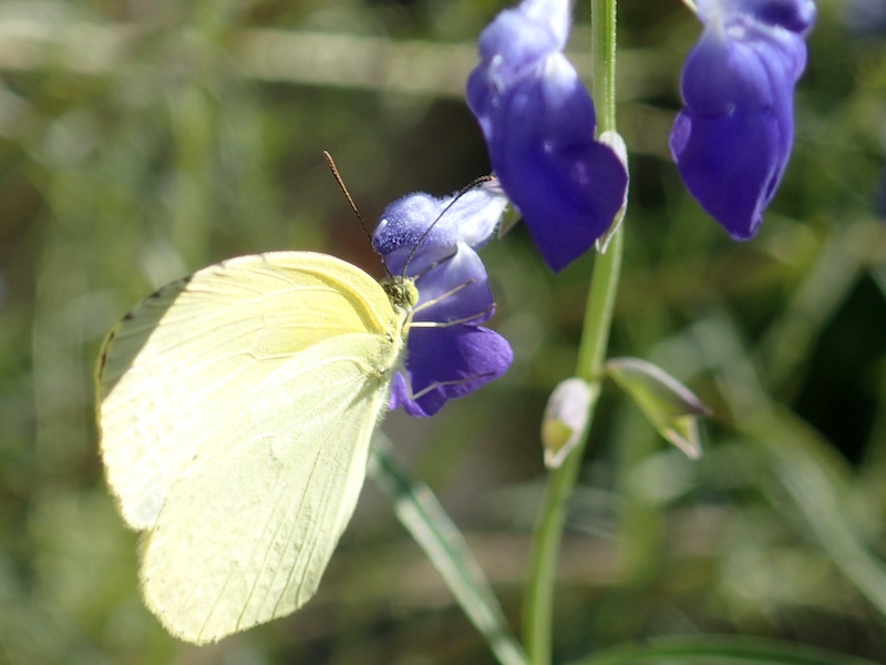 コバルトセージの花から花へ、セセリチョウ数匹,キタキチョウの白っぽい雌1匹と黄色い雄2匹が、吸蜜していました。キタキチョウは2匹(♂♀ or ♂2)でもつれながら飛んだこともありました。コバルトセージの茎とフジバカマのつぼみに、ダンダラテントウがいました。