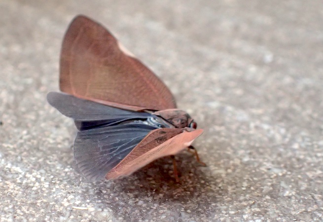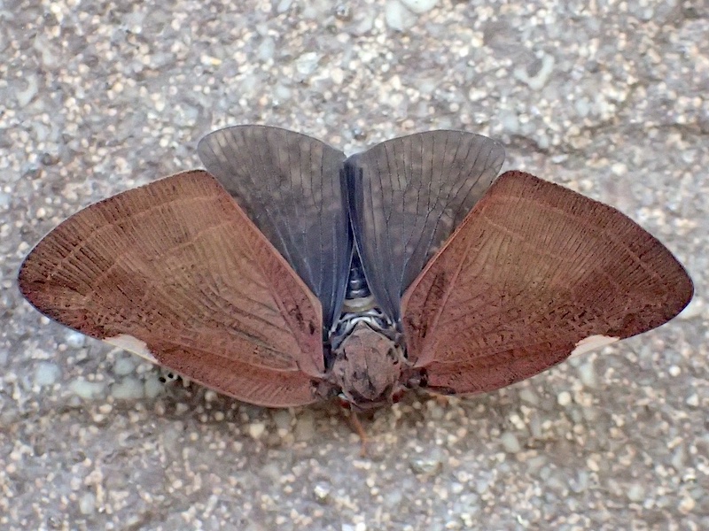 2025.10.2. 朝、外灯近くのタイルの上で、茶色い小さなガのように、チュウゴクアミガサハゴロモ(カメムシ目)が弱っているのか?翅を広げていました。広げた後翅を初めて見ました。