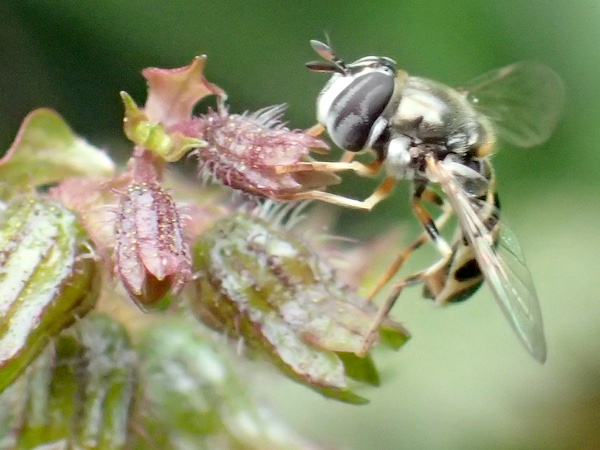 シママメヒラタアブ♀が、花の上部にあるおしべの花粉をなめていました。
