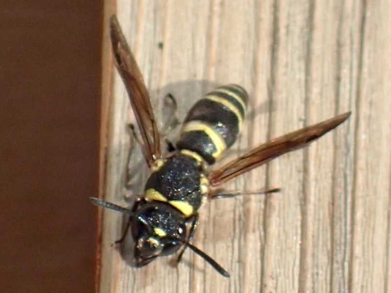 2025.7.18. 14:00 オデコフタオビドロバチ♀?30分後にはいなくなっていました。竹の外径は18mm、内径は14mmで、入口から覗くと、内側はきれいにツルツルになっていました。