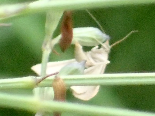 2025.10.11. アメリカピンクノメイガの卵や幼虫を探しました。幼虫は見つからず、ゴミをつけてすばやく動く、クサカゲロウの仲間の一種の幼虫を見つけました。