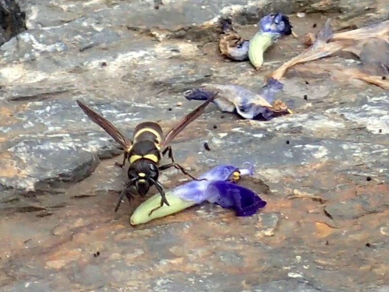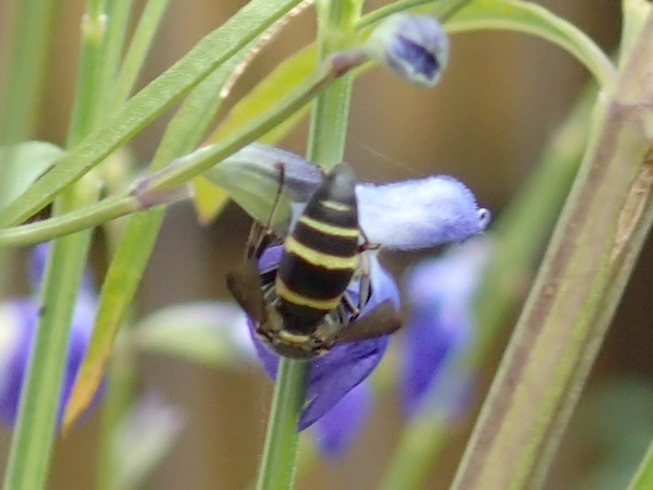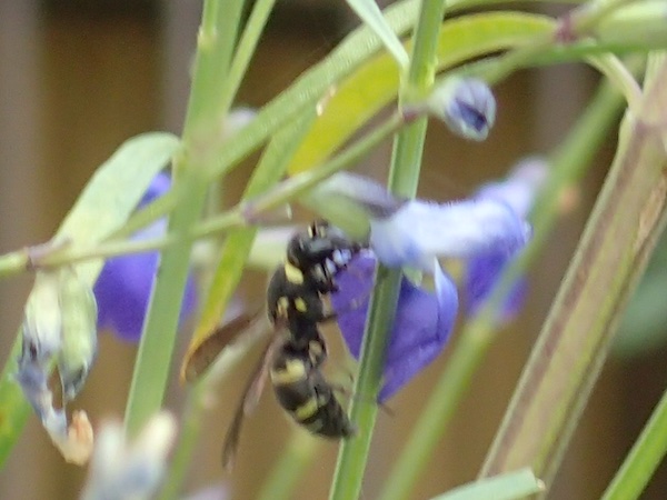 コバルトセージでミカドドロバチ♀?が飛び回っていましたが、ヒラタアブとは違って花に頭を突っ込むところは見られませんでした。調べるとベニフキノメイガの幼虫を狩るそうなので、アメリカピンクノメイガの幼虫も狩っていそうです。