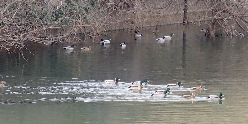 隣の池の端にはマガモが15羽以上が並んで休んでいて、池の中ほどではカワウ、キンクロハジロ、カイツブリ?数羽が泳いで潜ったりしていました。