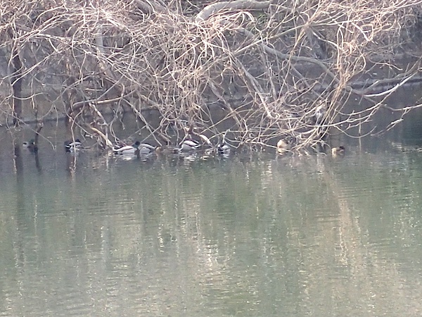 2026.3.6. 近くの池にヒドリガモやカモ類は見当たらず、隣の池にはマガモが30羽以上、カワウ3羽、カルガモ1羽ほかがいました。