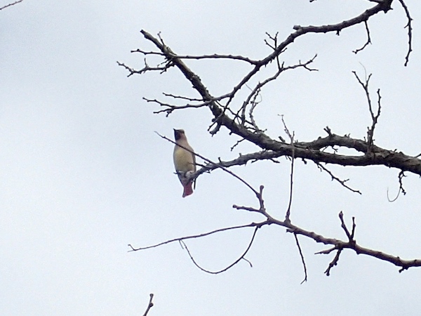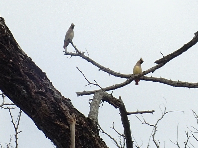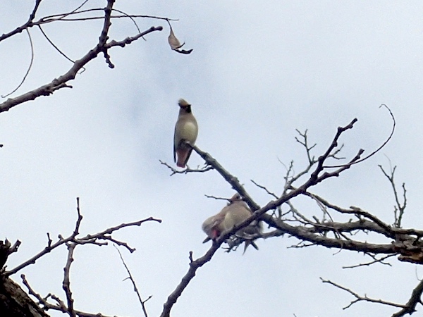2026.3.23. 朝から雨があがり曇り空、近くの池の上空を30羽くらいのレンジャクの群れが飛び回っていて、近くの木にも数羽とまりました。
