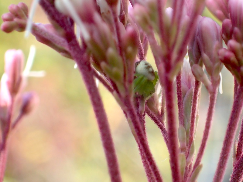 約2時間後に見るとクモの網はすっかり消えていて、フジバカマの花にコハナグモがいました。(クモの網はとても細く、水滴が消えただけかもしれません。)