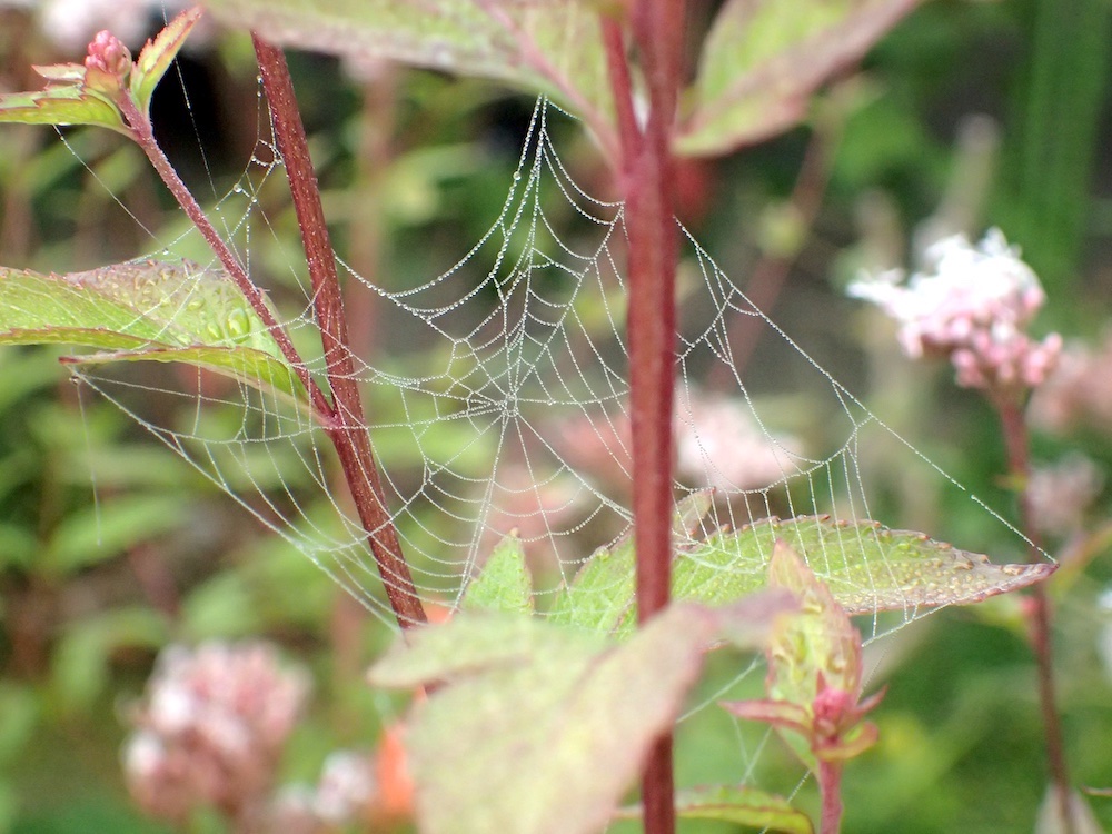 2025.11.27. 濃霧の朝、霧が晴れてフジバカマの花と花との隙間にずっといたとっても小さなコハナグモを探すと見つからず、代わりにあちこちに蜘蛛の糸が張っているのに気づきました。その中に小さな網がありました。