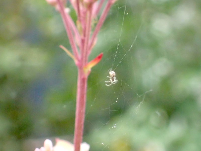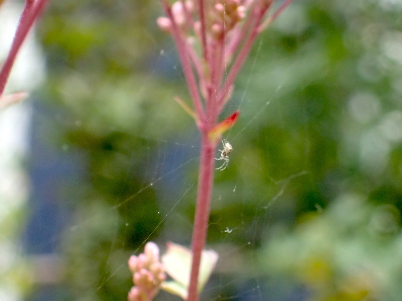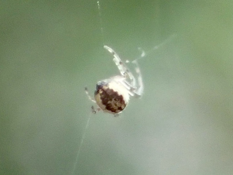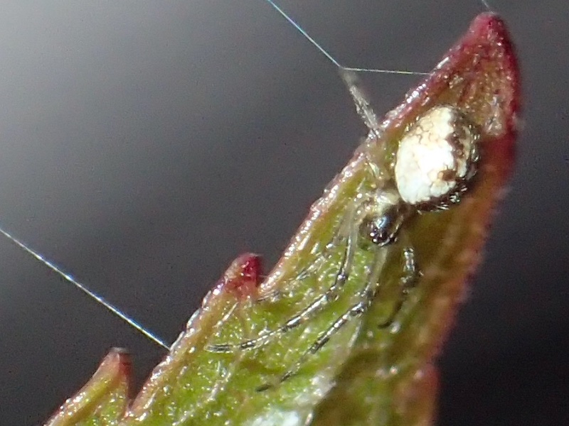 2025.12.3. 6日前にあったクモの網のすぐ近くに、ケシ粒くらいの小さなクモが宙に浮かんでいました。網の中心にいて、ヒメグモ科アシブトヒメグモ属??の一種のようで、先日の網の作者のようです。