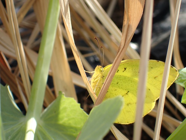 2026.1.16. 暖かく、キタキチョウが低く飛び回り、エンドウの根元で一休みしていました。